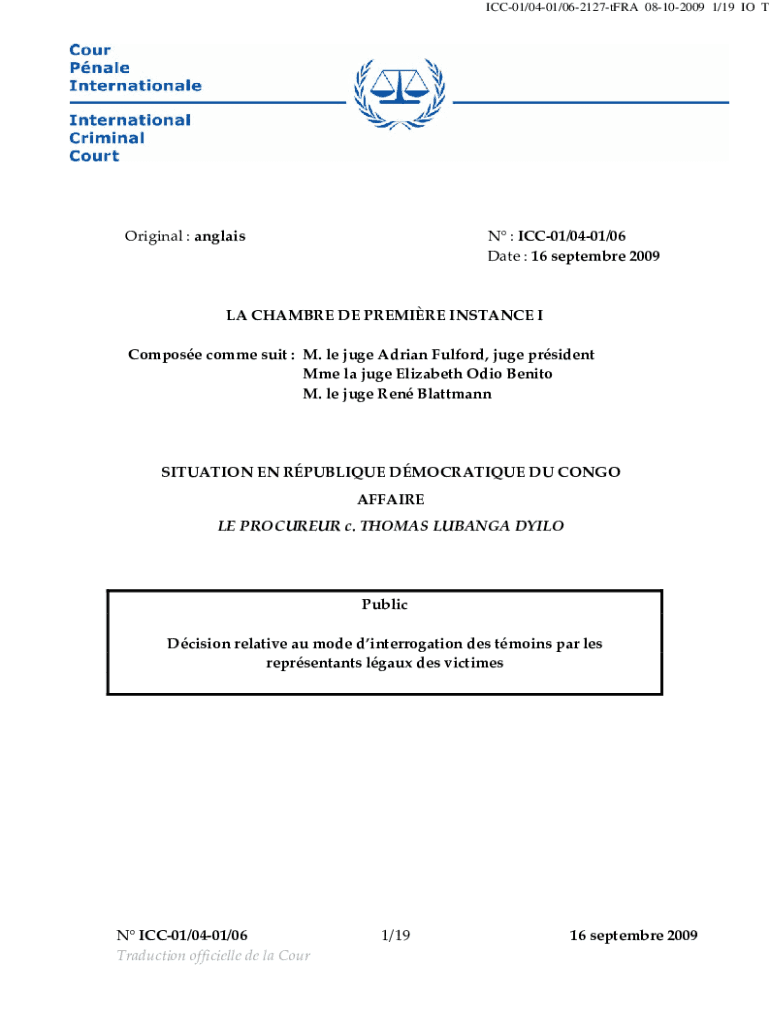 ICC01/0401/062127tFRA 08102009 1/19 IO T Original:angriest:ICC01/0401/06 Date:16septembre2009 LACHAMBREDEPREMIREINSTANCEI Composecommesuit: M.lejugeAdrianFulford, jugeprsident MmelajugeElizabethOdioBenito