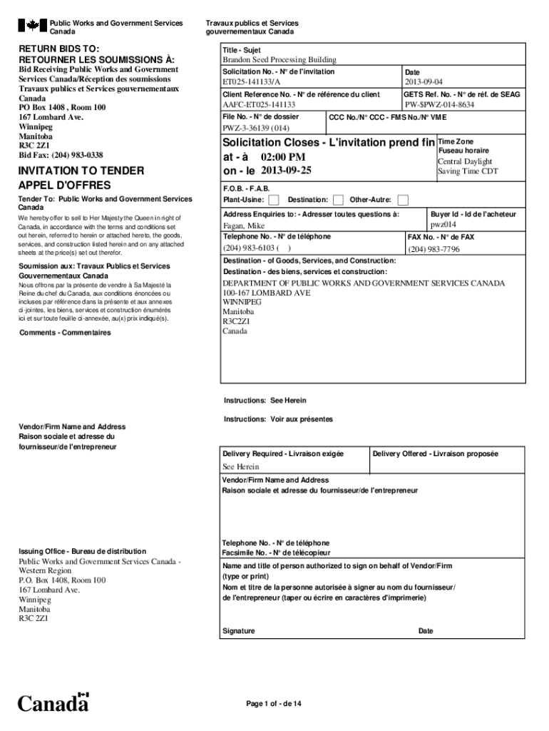 Public Works and Government Services CanadaTravaux public set Services gouvernementaux Canada1 1RETURN BIDS TO: RETURNER LES COMMISSIONS :Title Outbid Receiving Public Works and Government Services