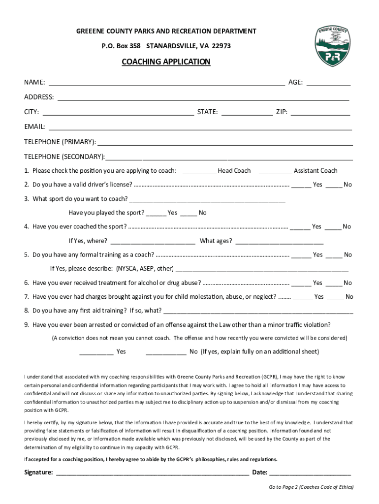 GREENE COUNTY PARKS AND RECREATION DEPARTMENT. O. Box 358 STANARDSVILLE, VA 22973COACHING APPLICATION NAME: ___ AGE: ___ ADDRESS: ___ CITY: ___ STATE: ___ ZIP: ___ EMAIL: ___ TELEPHONE (PRIMARY):