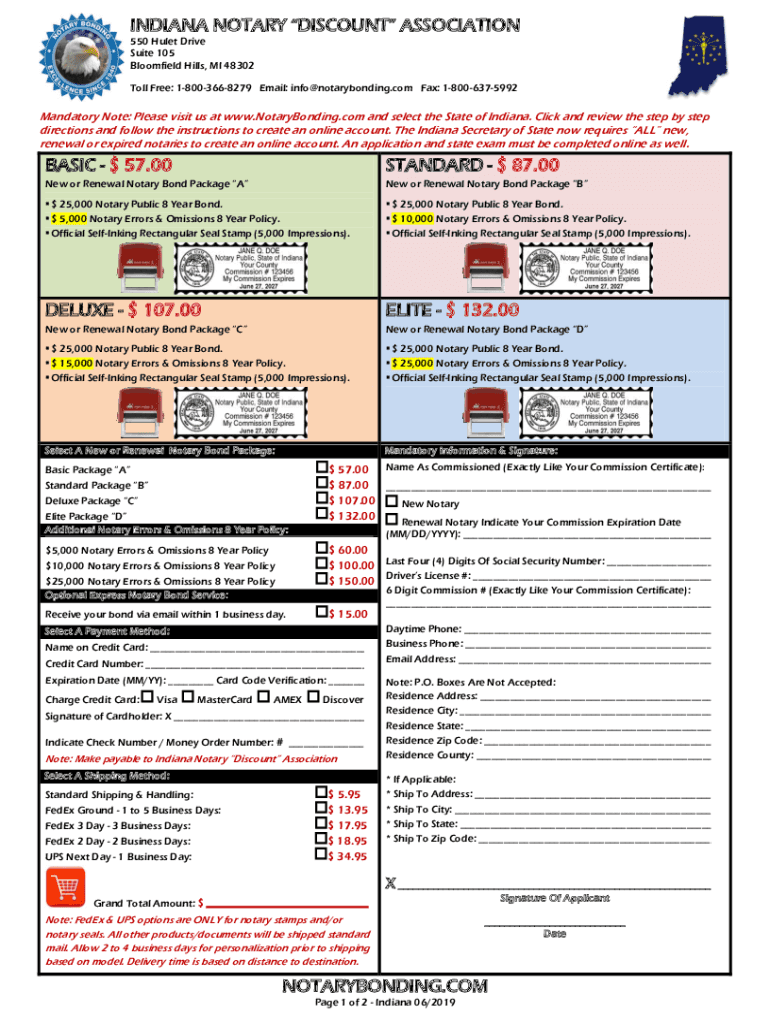INDIANA NOTARY DISCOUNT ASSOCIATION 550 Let Drive Suite 105 Bloomfield Hills, MI 48302 Toll Free: 18003668279 Email: info@notarybonding.com Fax: 18006375992Mandatory Note: Please visit us at www.NotaryBonding.com
