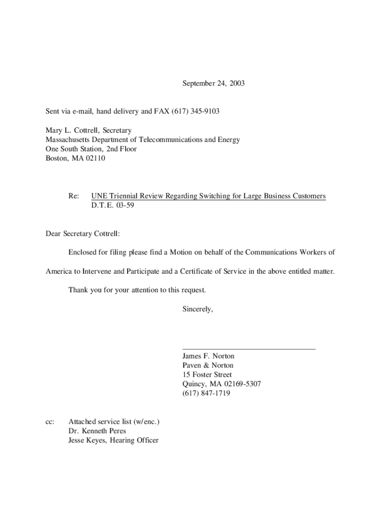 September 24, 2003, Sent via email, hand delivery and FAX (617) 3459103 Mary L. Cantrell, Secretary Massachusetts Department of Telecommunications and Energy One South Station, 2nd Floor Boston, MA