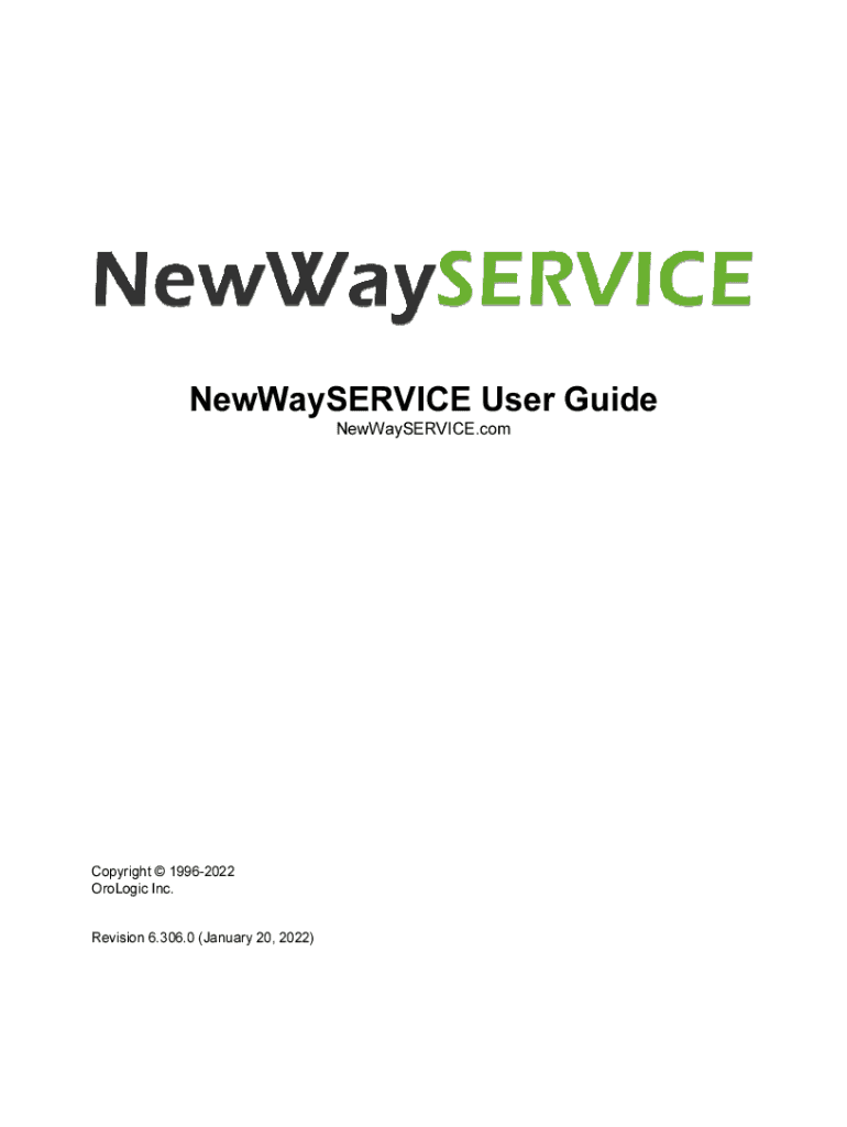 NewWaySERVICE User Guide NewWaySERVICE.copyright 19962022 Horologic Inc. Revision 6.306.0 (January 20, 2022)Table of Contestable of Contents Table of Contents ...............................................................................................................