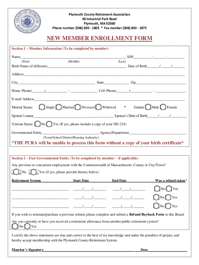 Plymouth County Retirement Association 60 Industrial Park Road Plymouth, MA 02360 Phone number (508) 830 1803 * Fax number (508) 830 1875NEW MEMBER ENROLLMENT FORM Section 1 Member Information (To