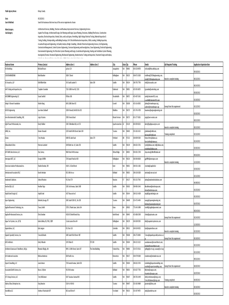 Public Agency Name:Kit sap Countywide: Search Method:05/28/2021 Search for businesses that meet any of the service requirements chosenMainCategory: Subcategory:Architectural Services, Building, Structure