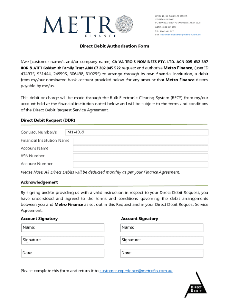 LEVEL 11, 35 CLARENCE STREET, SYDNEY NSW 2000 PO BOX R1735 ROYAL EXCHANGE, NSW 1225 ABN 44 600 674 093 TEL 1300 362 627 EM customer.experience@metrofin.com.auDirect Debit Authorization Form I/we [customer