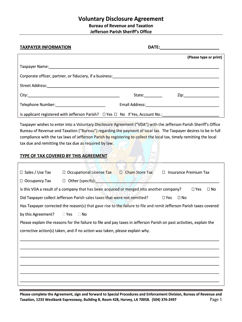 Voluntary Disclosure Agreement Bureau of Revenue and Taxation Jefferson Parish Sheriff s Office TAXPAYER INFORMATION DATE: (Please type or print) Taxpayer Name: Corporate officer, partner, or fiduciary,