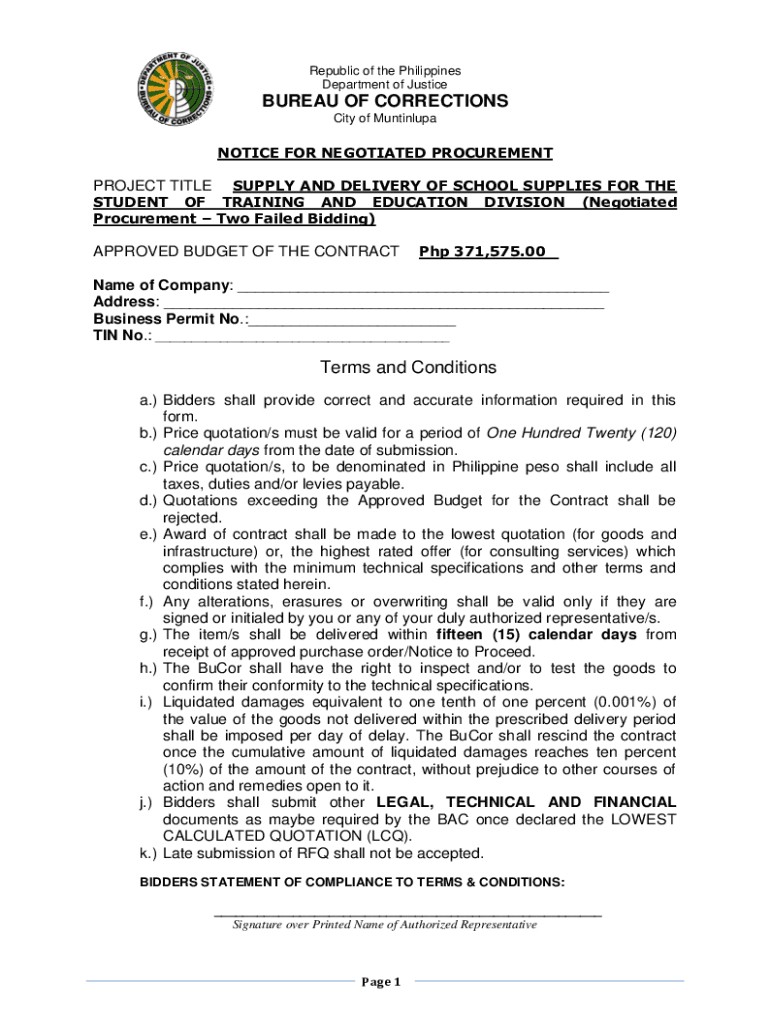 Republic of the Philippines Department of JusticeBUREAU OF CORRECTIONS City of MuntinlupaNOTICE FOR NEGOTIATED PROCUREMENT SUPPLY AND DELIVERY OF SCHOOL SUPPLIES FOR THE STUDENT OF TRAINING AND EDUCATION