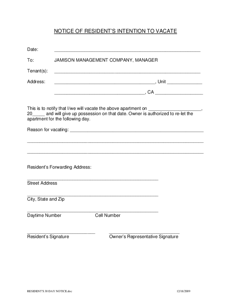 NOTICE OF RESIDENTS INTENTION TO VACATE Date:___To:JAMISON MANAGEMENT COMPANY, MANAGERTenant(s):___Address:___, Unit ___ ___, CA ___This is to notify that I/we will vacate the above apartment on ___,