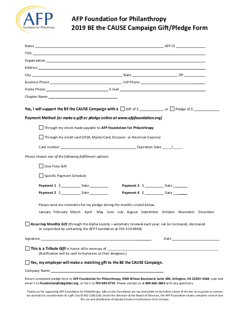 AFP Foundation for Philanthropy 2019 BE the CAUSE Campaign Gift/Pledge Form Name Title Organization Address CityStateBusiness Photocell Phoneme Phone ZIP ___EmailChapter Name___Yes, I will support