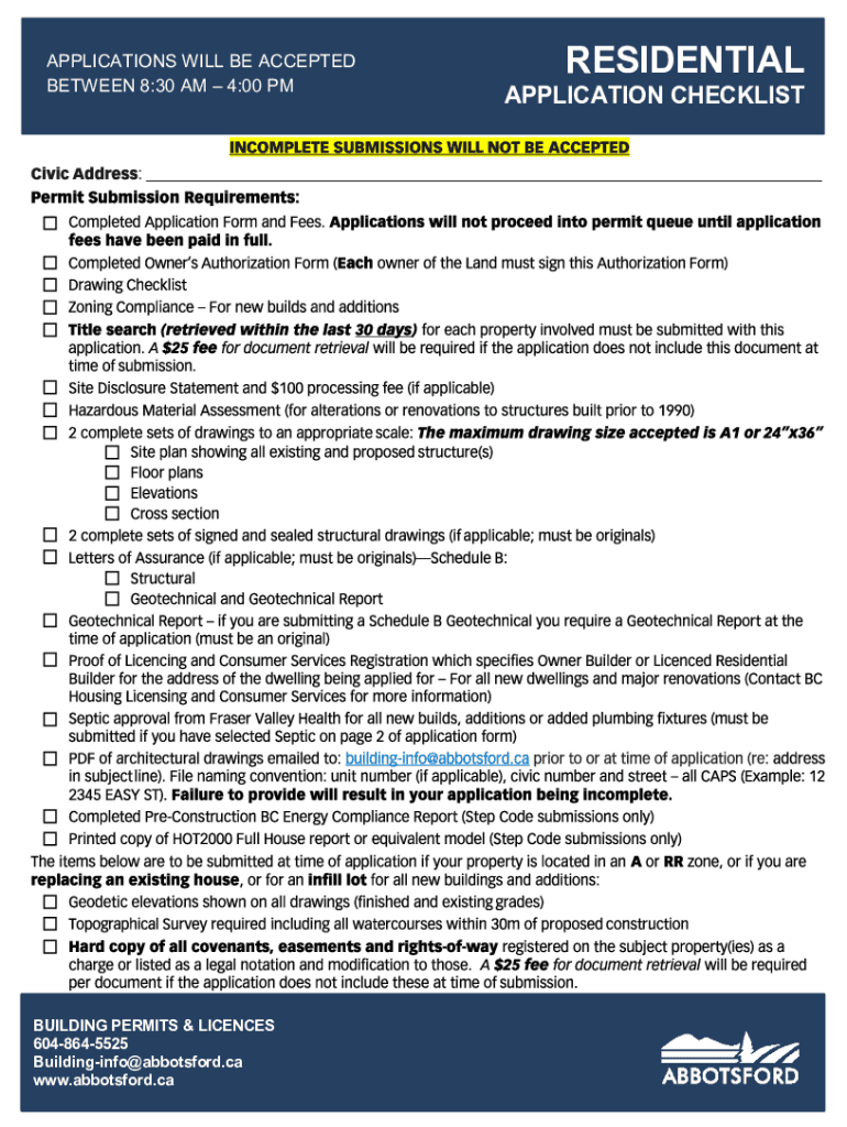 I APPLICATIONS WILL BE ACCEPTED BETWEEN 8:30 AM 4:00 PM BUILDING PERMITS & Licenses 6048645525 Buildinginfo@abbotsford.ca www.abbotsford.caRESIDENTIAL APPLICATION CHECKLISTRESIDENTIALAPPLICATIONS