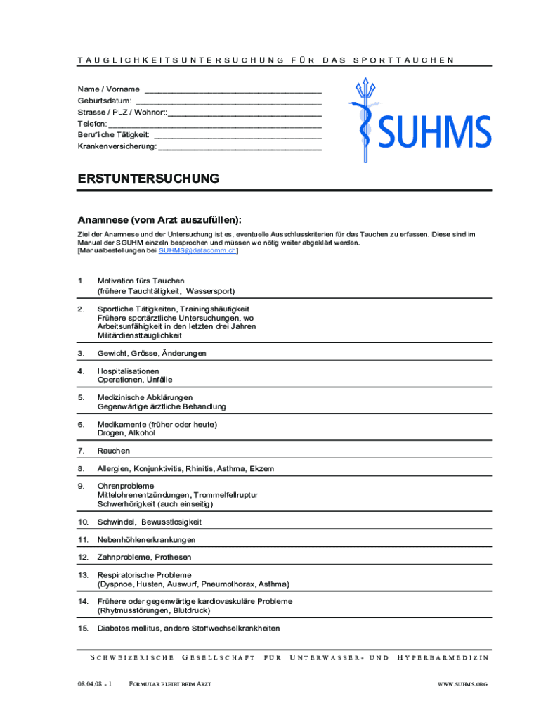 TAUGLICHKEITSUNTERSUCHUNGFR WAS SPORTTAUCHENName / Surname: ___ Geburtsdatum: ___ Stress / PLY / Cohort:___ Telephone: ___ Berufliche Ticket: ___ Krankenversicherung: ___ERSTUNTERSUCHUNG Anamneses