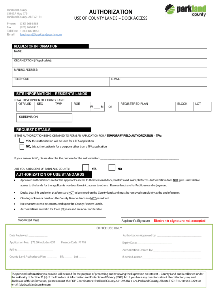 Parkland County 53109A Hwy 779 Parkland County, AB T7Z 1R1 Phone: Fax: Toll Free: Email:AUTHORIZATION USE OF COUNTY LANDS DOCK ACCESS(780) 9688888 (780) 9688413 18888800858 landmgmt@parklandcounty.comREQUESTOR