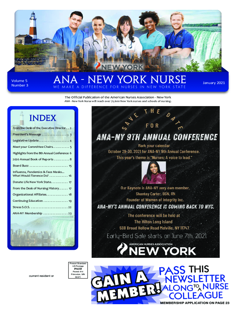 Volume 5 Number 3ANA New York Nurse January 2021w e m a k e a d i f f e r e n c e f o r n u r s e s i n n e w yo r k s that e The Official Publication of the American Nurses Association New York ANA
