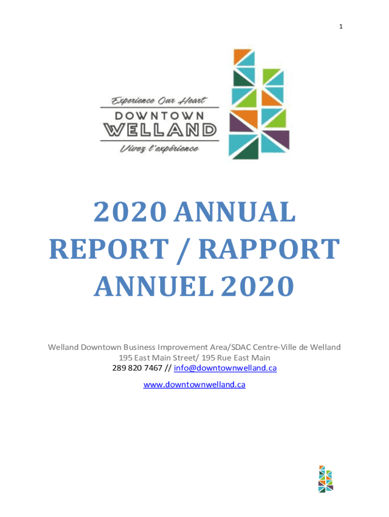 12020 ANNUAL REPORT / RAPPORT ANNUAL 2020 Welland Downtown Business Improvement Area/SAC Centreville de Welland 195 East Main Street/ 195 Rue East Main 289 820 7467 // info@downtownwelland.ca www.downtownwelland.ca2TABLE