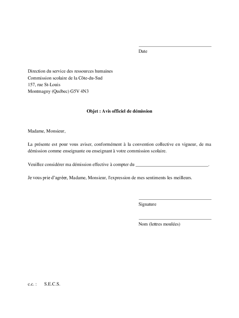 ___ Redirection Du service DES resources humans Commission Claire de la CteduSud 157, rue St Louis Montana (Quebec) G5V 4N3Objet : Avis official de dmissionMadame, Monsieur, La present est pour vows