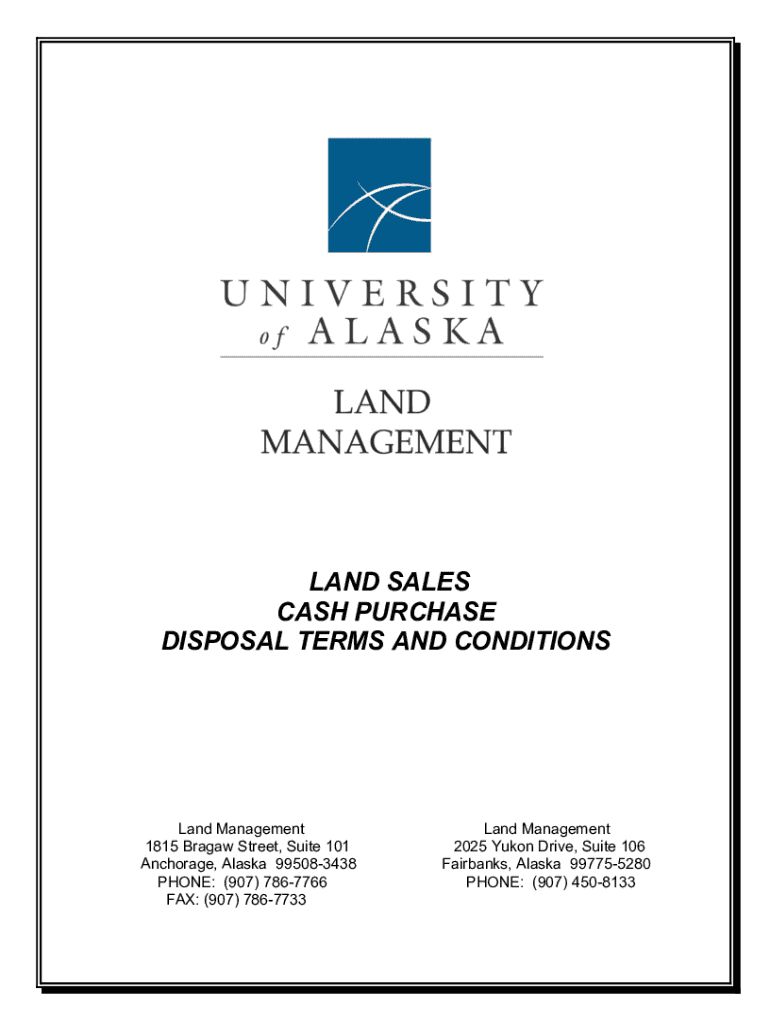 LAND SALES CASH PURCHASE DISPOSAL TERMS AND CONDITIONS Land Management 1815 Brag aw Street, Suite 101 Anchorage, Alaska 995083438 PHONE: (907) 7867766 FAX: (907) 7867733Land Management 2025 Yukon