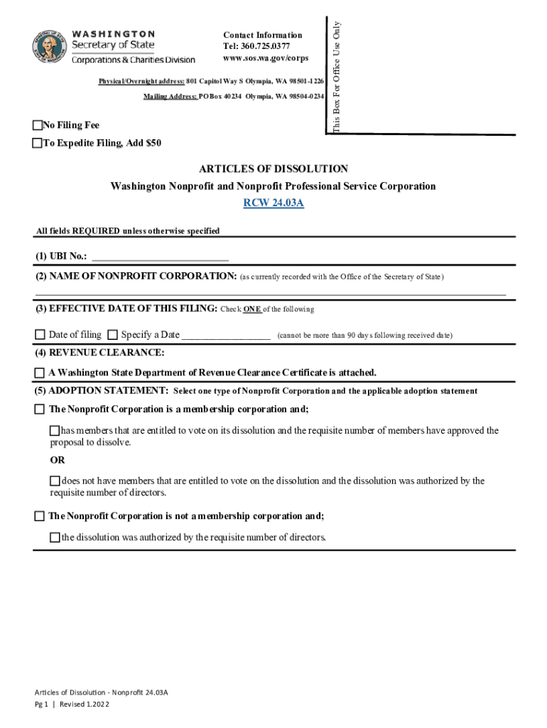 Corporations & Charities Division Physical/Overnight address: 801 Capitol Way S Olympia, WA 985011226 Mailing address: PO Box 40234 Olympia, WA 985040234 Tel: 360.725.0377 SOS.Wei.gov/corpsINSTRUCTIONS: