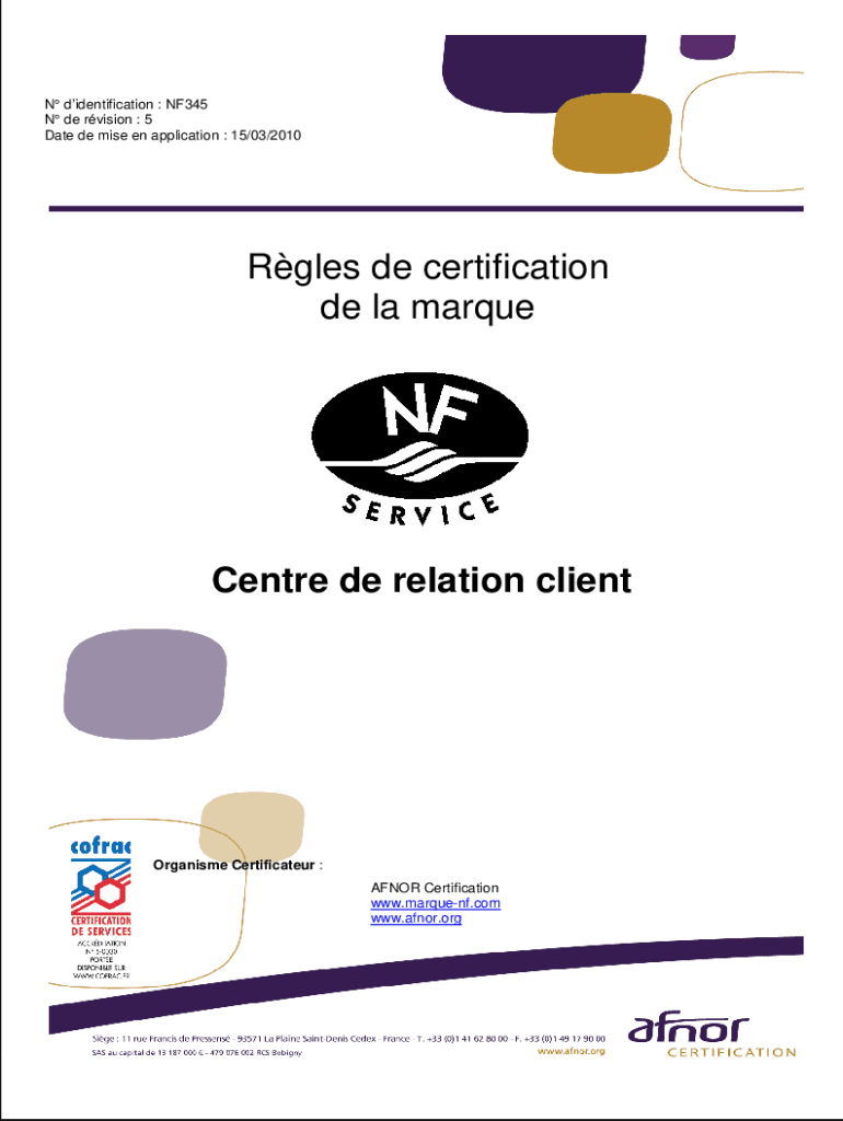 Nd's identification : NF345 N de vision : 5 Date demise en application : 15/03/2010Rgles de certification DE la marqueCentre de relation clientOrganisme Certificate : AFNOR Certification www.marquenf.com
