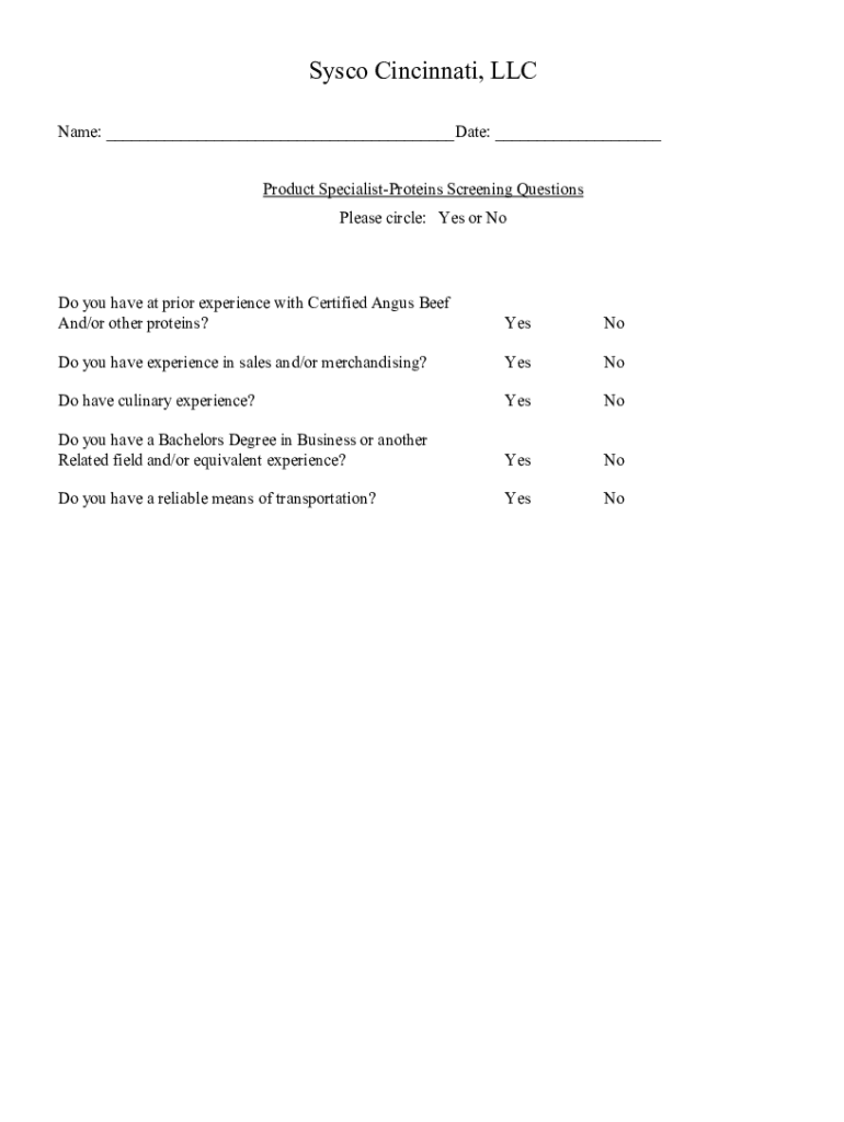 Sysco Cincinnati, LLC Name: ___ Date: ___ Product SpecialistProteins Screening Questions Please circle: Yes or Node you have at prior experience with Certified Angus Beef And/or other proteins? Escudo