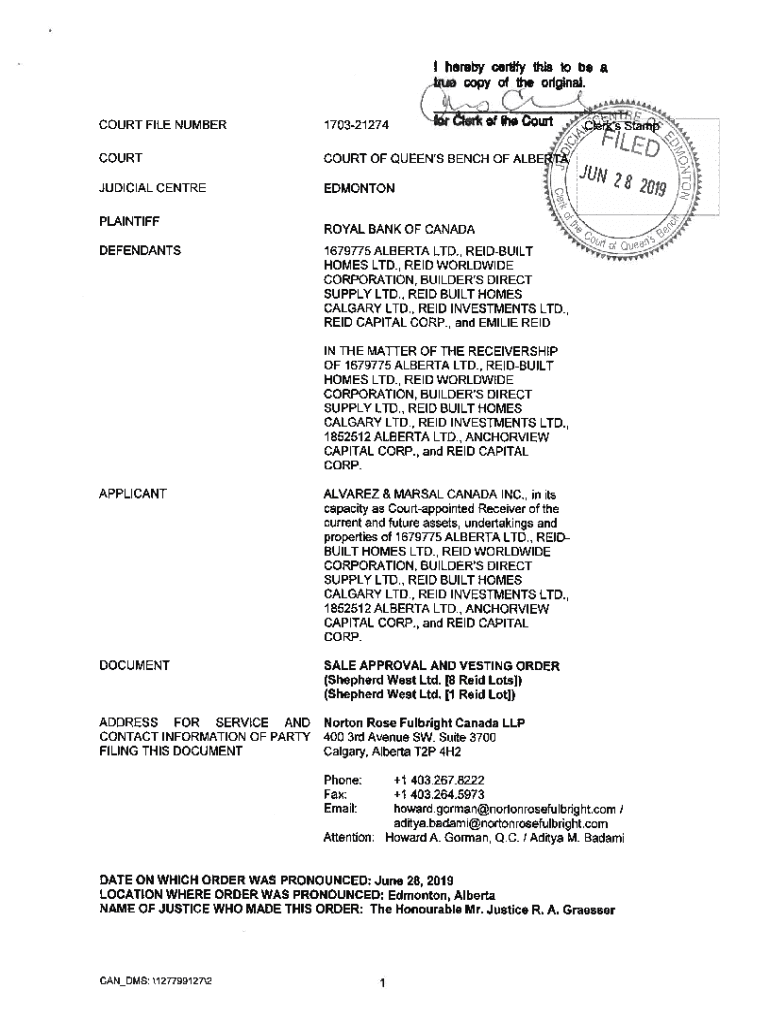 I hereby certify this to be a TRT copy of the original. COURT FILE NUMBER170321274COURTCOURT OF QUEEN'S BENCH OF ALBLJUDICIAL CENTREEDMONTONPLAINTIFF DEFENDANTSROYAL BANK OF CANADA 1679775 ALBERTA