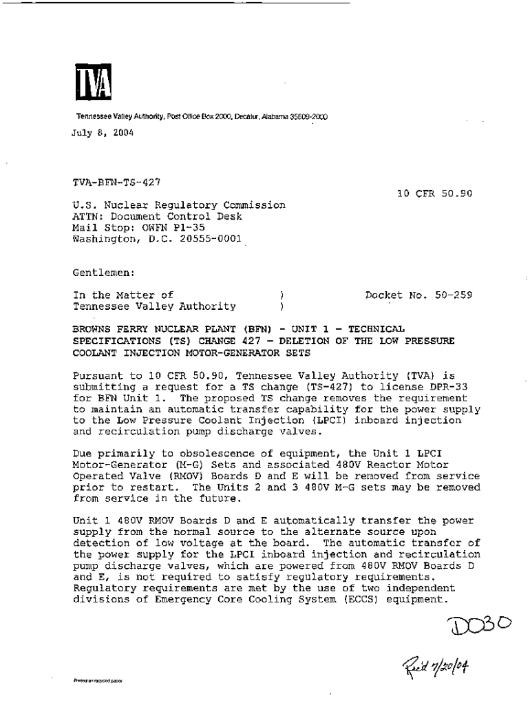 Get the free Browns Ferry Nuclear Plant (BFN) - Unit 1 - Technical Specifications (TS) Change 427...