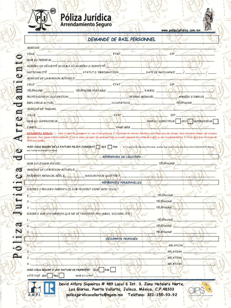 WWW.polizajuridica.com.demand DE BAIL PERSONNEL ADDRESS: ___ VILLA ___ EAT ___ ZIP ___ NOT DU PREFER ___ NU MRO DE SECURITY SOCIAL OF NU MRO D\'IDENTITY ___ NATIONALIST ___ STATUS D\'IMMIGRATION ___