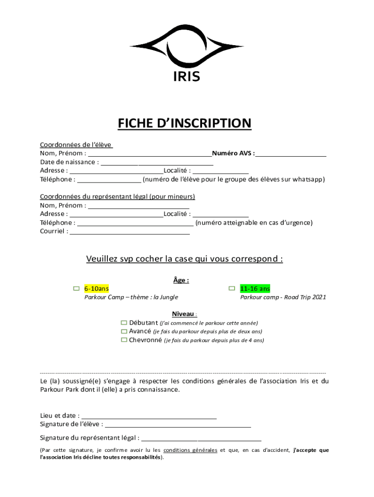 Get the free FICHE D'INSCRIPTION - iris parkour