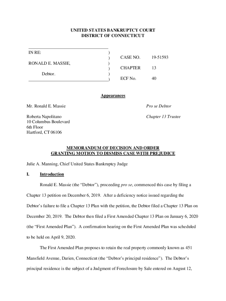 UNITED STATES BANKRUPTCY COURT DISTRICT OF CONNECTICUT ___ IN RE:)) RONALD E. MASSIVE,) ) Debtor. ) ___)CASE NO.1951593CHAPTER13ECF No.40Appearances Mr. Ronald E. Masseur SE Debtor Roberta Napolitana