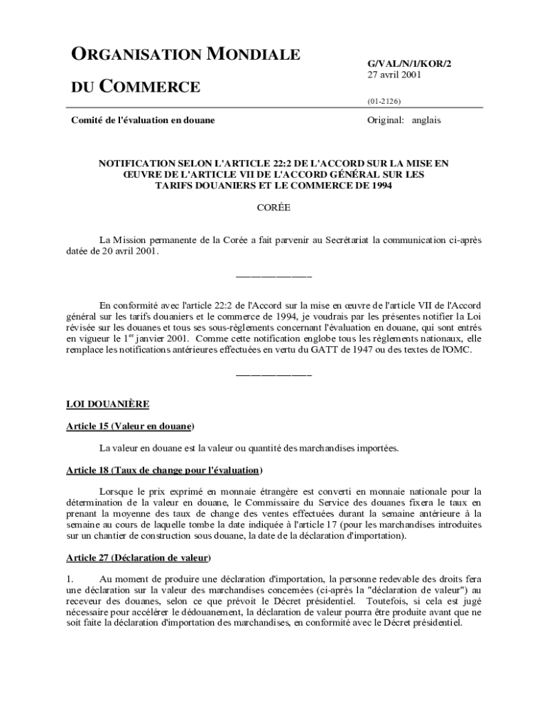 Organization MONDALE DU COMMERCE/VAL/N/1/KOR/2 27 April 2001 (012126)Original: anglaisComit de l\'valuation en douaneNOTIFICATION SALON L\'ARTICLE 22:2 DE L\'ACCORD SUR LA MILE EN URE DE L\'ARTICLE
