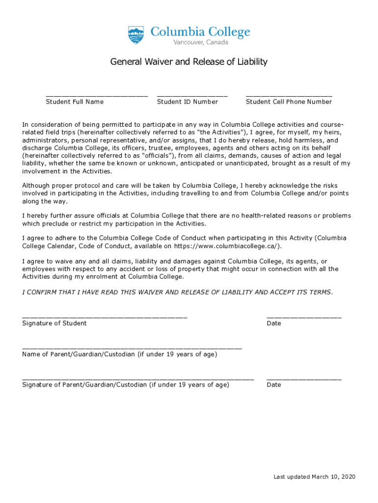 General Waiver and Release of Liability ___ Student Full Name___ Student ID Number___ Student Cell Phone Numbering consideration of being permitted to participate in any way in Columbia College activities
