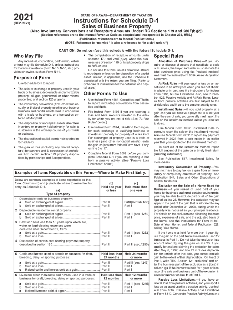 2021STATE OF HAWAIIDEPARTMENT OF TAXATIONInstructions for Schedule D1(REV. 2021)(Also Involuntary Conversions and Recapture Amounts Under IRC Sections 179 and 280F(b)(2))(Section references are to