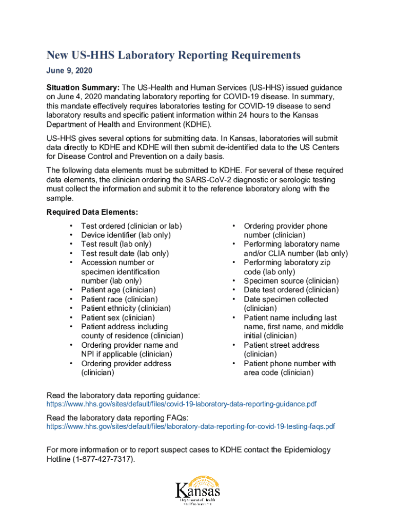 New US HHS Laboratory Reporting Requirements June 9, 2020, Situation Summary: The Health and Human Services (US HHS) issued guidance on June 4, 2020, mandating laboratory reporting for COVID-19 disease.