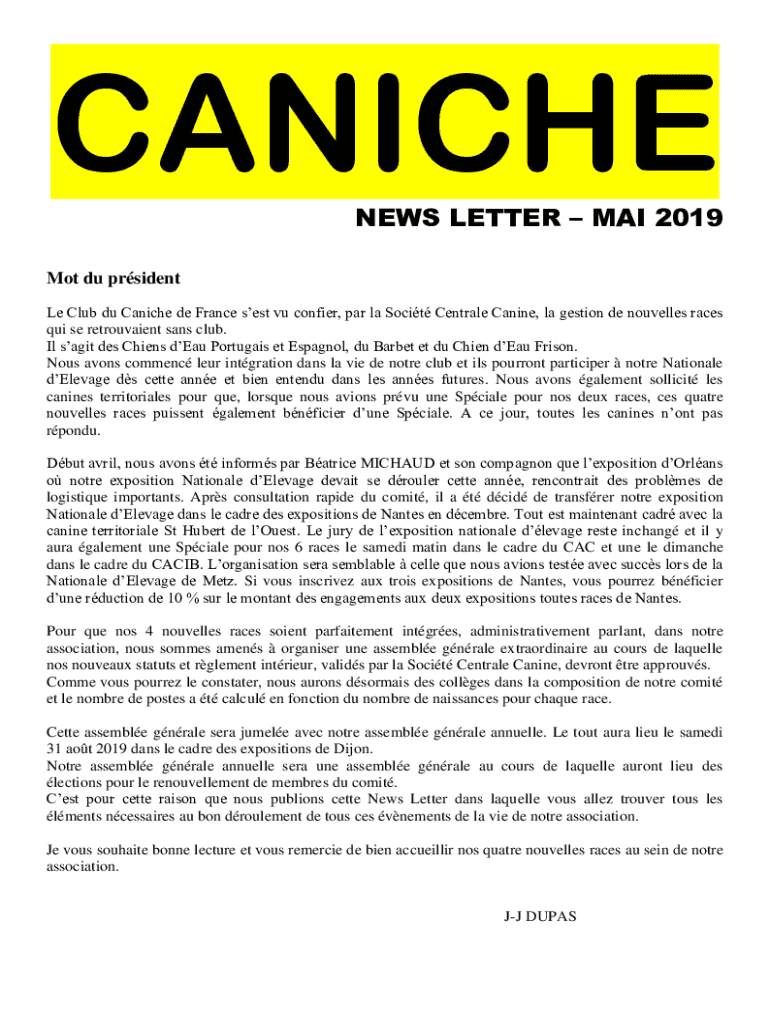CACHE Newsletter MAI 2019 Mot Du president Le Club du Ca niche de France set VU confer, par la So cit Central Canine, la section DE novellas races quit SE retrouvaient sans club. IL sag it DES Chains