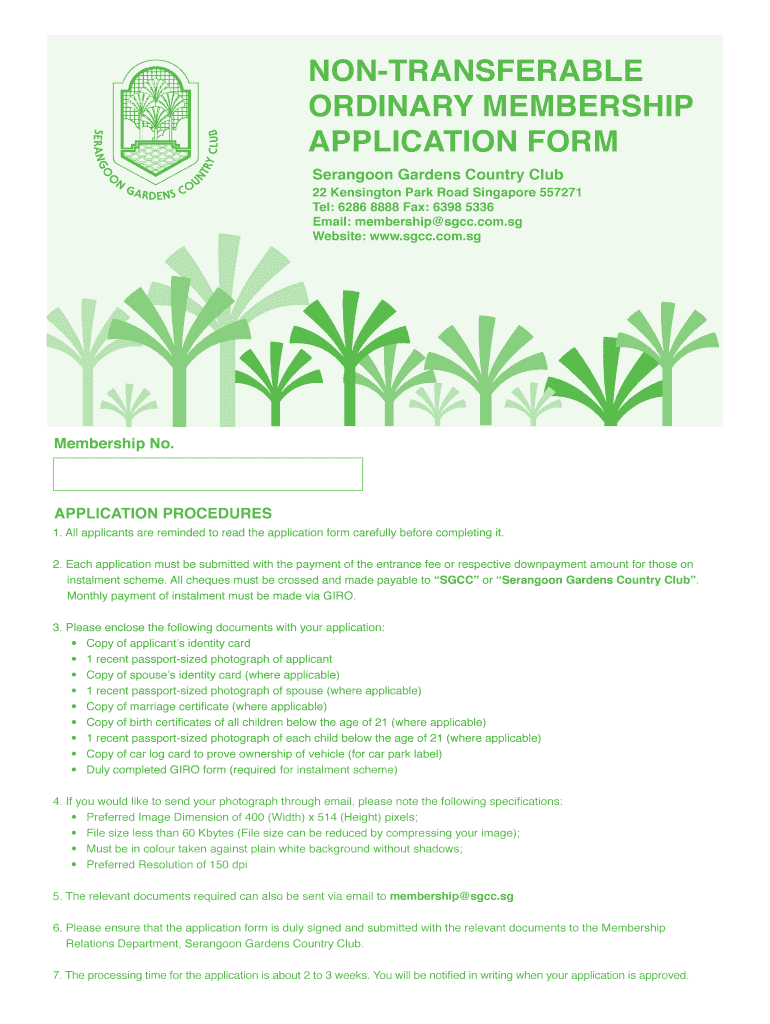 NON-TRANSFERABLE ORDINARY MEMBERSHIP APPLICATION FORM Rangoon Gardens Country Club 22 Kensington Park Road Singapore 557271 Tel: 6286 8888 Fax: 6398 5336 Email: membership sgcc.com.SG Website: www.sgcc.com.sg