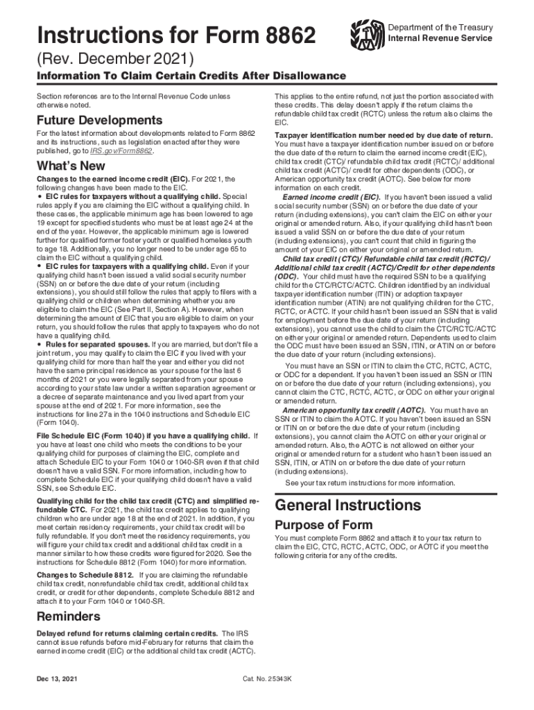 Instructions for Form 8862Department of the Treasury Internal Revenue Service(Rev. December 2021)Information To Claim Certain Credits After Disallowance This applies to the entire refund, not just