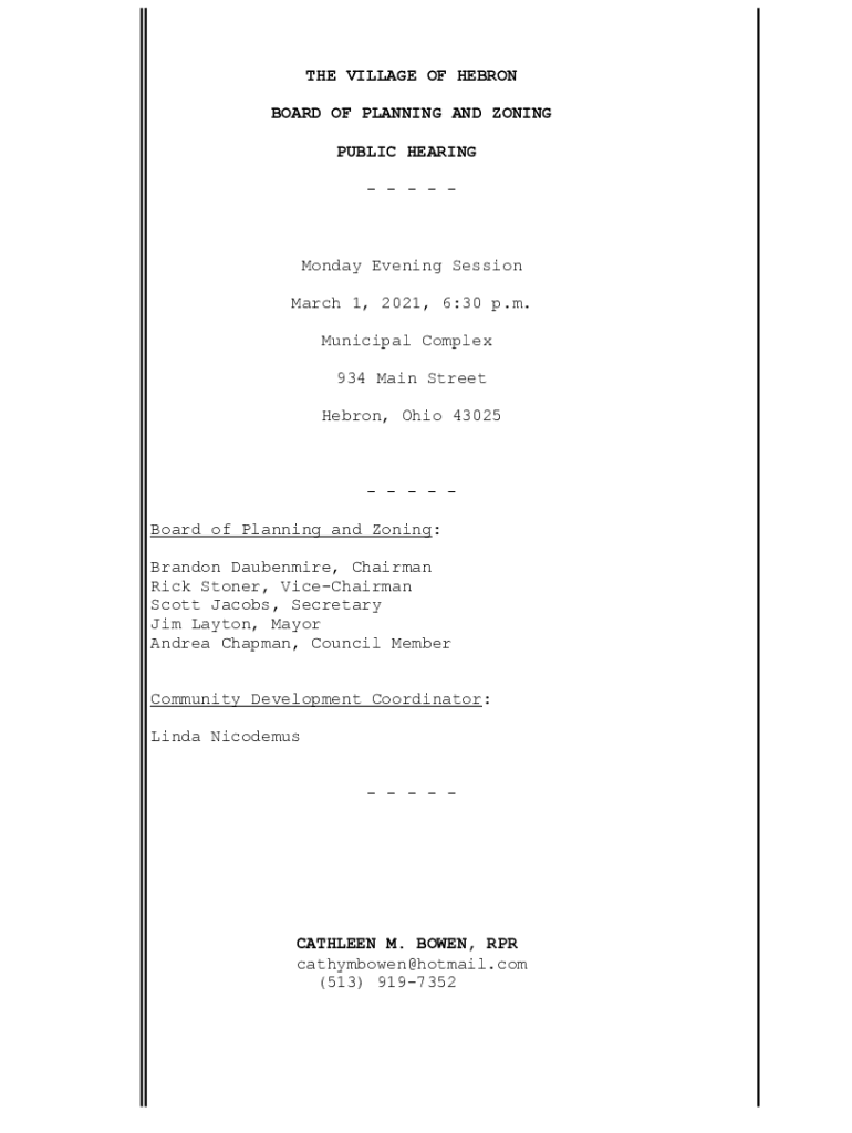 THE VILLAGE OF HERON BOARD OF PLANNING AND ZONING PUBLIC HEARING Monday Evening Session March 1, 2022, 6:30 p.m. Municipal Complex 934 Main Street Heron, Ohio 43025 Board of Planning and Zoning: Brandon