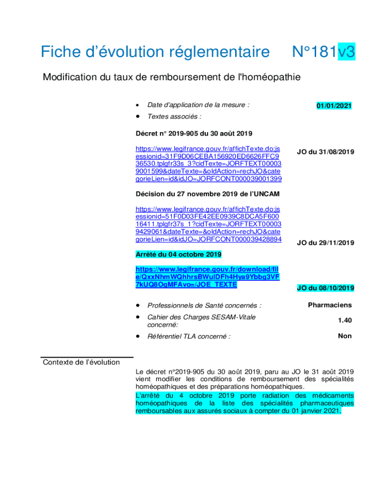 Fiche evolution rglementaireN181v3Modification Du tax DE reimbursement de l\'homeopathic Dated application DE la measure :Texts assoc is :01/01/2021Dcret n 2019905 Du 30 AOT 2019 HTTPS://www.legifrance.gouv.fr/affichTexte.do;js