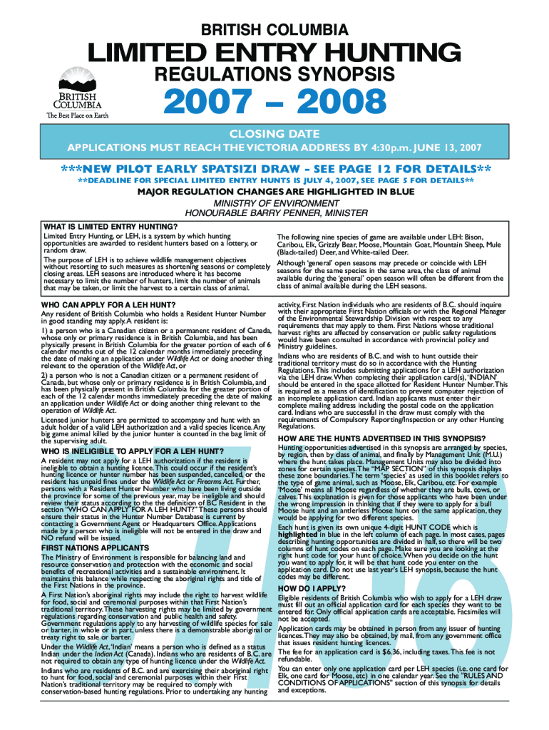BRITISH COLUMBIALIMITED ENTRY HUNTING REGULATIONS SYNOPSIS2007 2008 CLOSING DATE APPLICATIONS MUST REACH THE VICTORIA ADDRESS BY 4:30p.m. JUNE 13, 2007***NEW PILOT EARLY SPATIAL DRAW SEE PAGE 12 FOR
