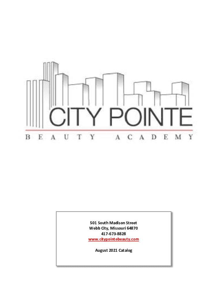 501 South Madison Street Webb City, Missouri 64870 4176738828 www.citypointebeauty.com August 2021 Cataloging Point Beauty Academy CONTENT Mission, Community, Facility Important Information Academic