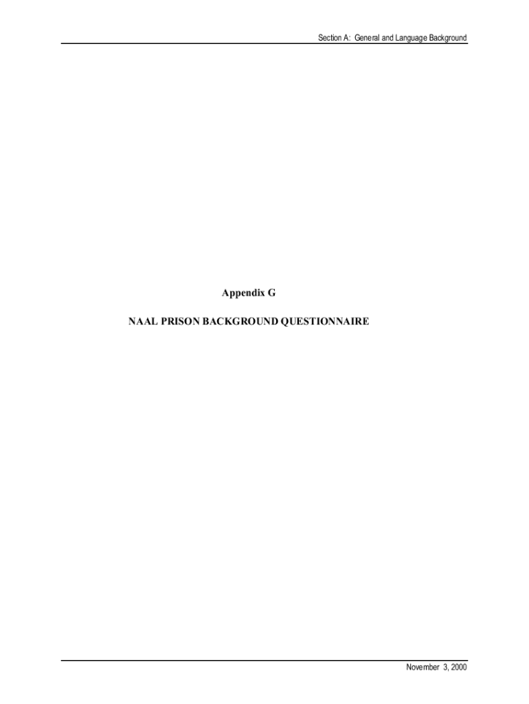 Section A: General and Language BackgroundAppendix G NAVAL PRISON BACKGROUND QUESTIONNAIRE November 3, 2000NAAL Prison Background QuestionnaireInstructions for Reading NAVAL Prison Background Questionnaire