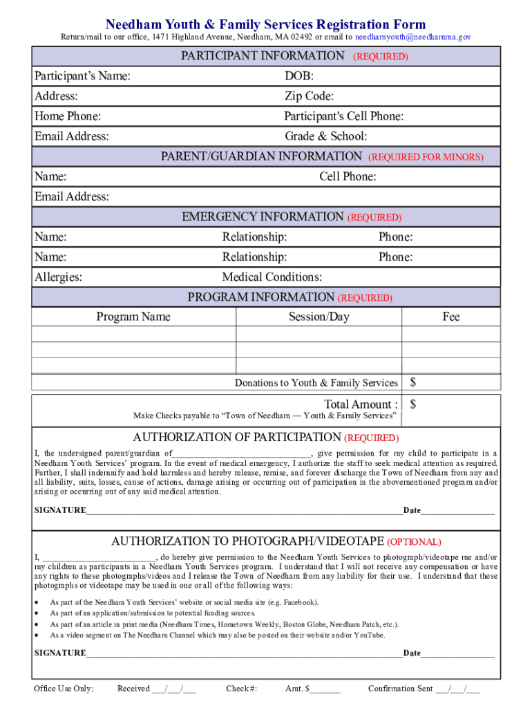 Needham Youth & Family Services Registration FormReturn/mail to our office, 1471 Highland Avenue, Needham, MA 02492 or email to needhamyouth@needhamma.govPARTICIPANT INFORMATION(REQUIRED)Participants