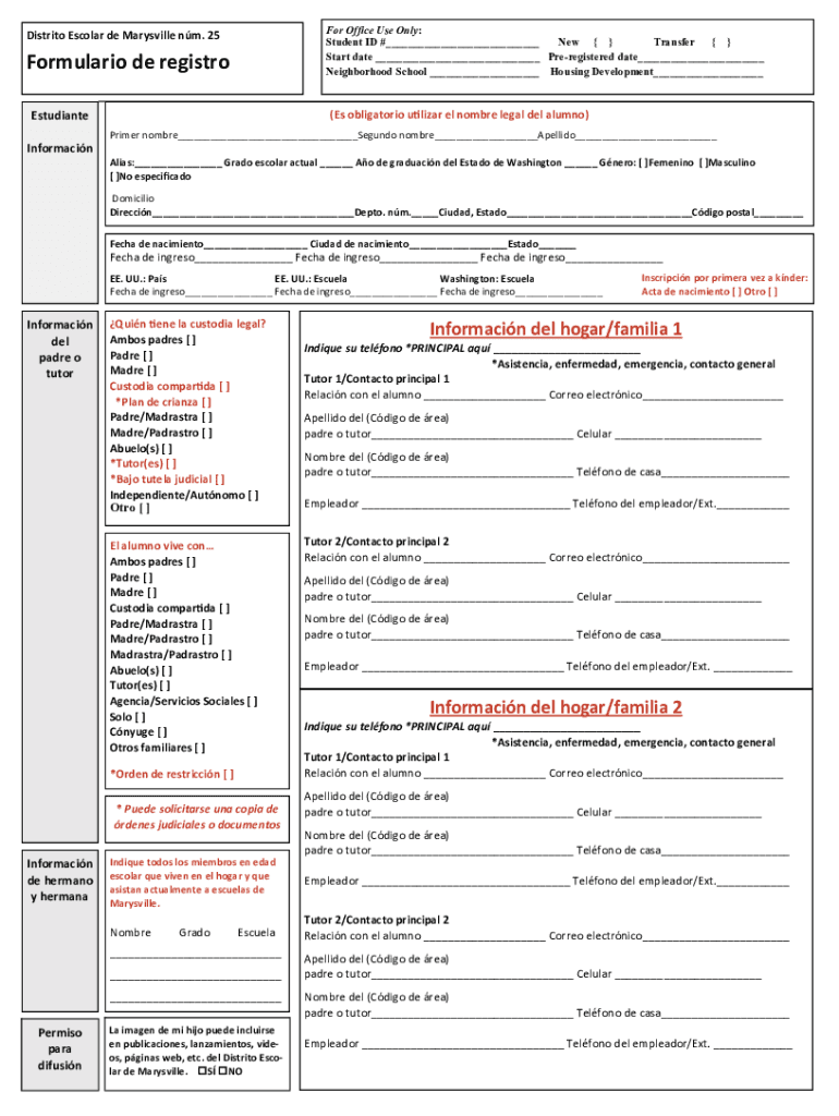 DistritoEscolardeMarysvillenm.25 Formularioderegistro Estudiante Information For Office Use Only: Student ID #___ New Transfer Start date ___ Preregistered date___ Neighborhood School ___ Housing