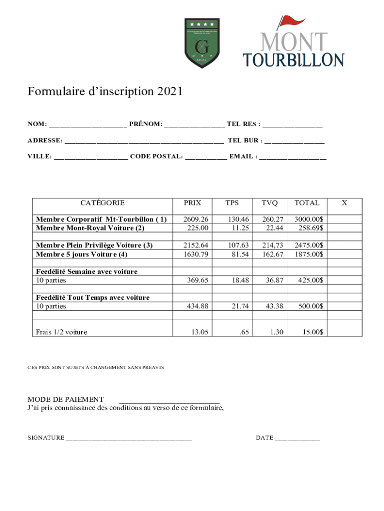 Formula ire inscription 2021 NOT: ___ PROM: ___ TEL RES : ___ ADDRESS: ___ TEL BUR : ___ VILLA: ___ CODE POSTAL: ___ EMAIL : ___CATGORIEPRIXTPSTVQTOTALMembre Corporate MtTourbillon (1) Member Mont
