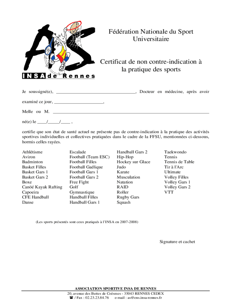 Formation National Du Sport UniversitaireCertificat de non contraindication la critique DES sports sous sign(e), ___, Doctor en decline, APRS avoid examine CE four, ___, Melee of M. ___ n(e) LE ___/___/___,