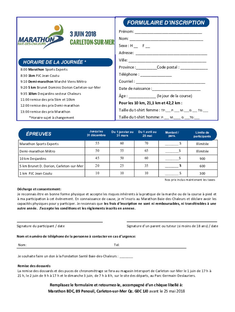 FORMULA IRE INSCRIPTION Prom: ___ Not: ___ See : H __F __Address: ___ Villa: ___HORA IRE DE LA JOURNEY *Province :___Code postal : ___8:00 Marathon Sports Experts 8:30 1 km PJC Jean CoutuTlphone