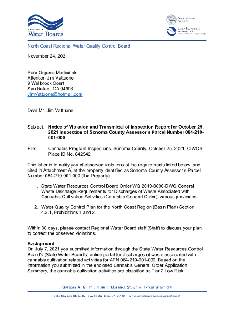 North Coast Regional Water Quality Control Board November 24, 2021Pure Organic Medicinal Attention Jim Attune 9 Cellblock Court San Rafael, CA 94903 JimVattuone@hotmail.comDear Mr. Jim Attune:Subject: