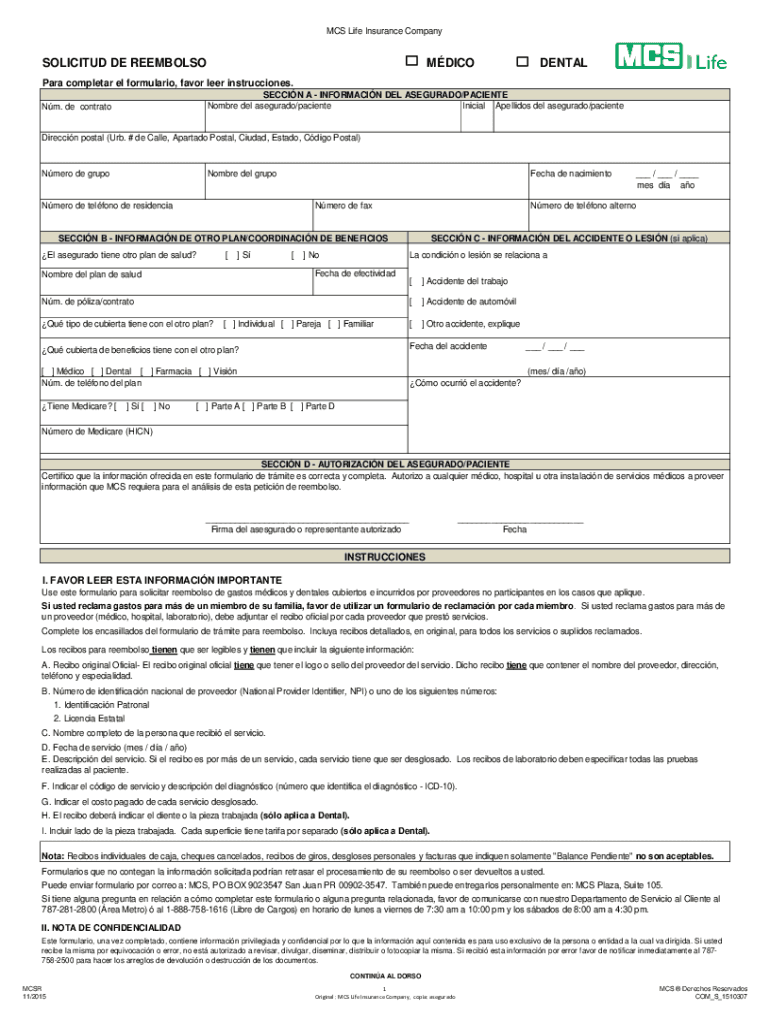 MCS Life Insurance CompanySOLICITUD DE REEMBOLSOMDICODENTALPara complete rel formulation, favor leer instructions. SECTION A INFORMATION DEL SEGUNDO/PATIENTS Hombre Del Segundo/patients Initial Spellings
