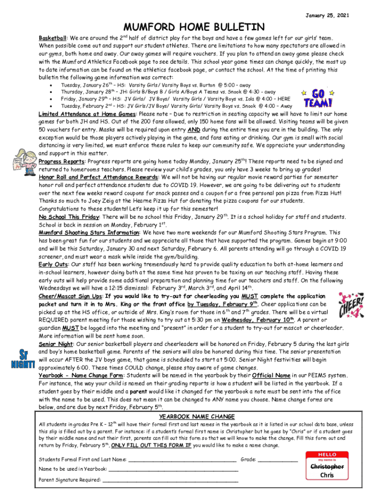 January 25, 2021MUMFORD HOME BULLETIN Basketball: We are around the 2nd half of district play for the boys and have a few games left for our girls team. When possible come out and support our student
