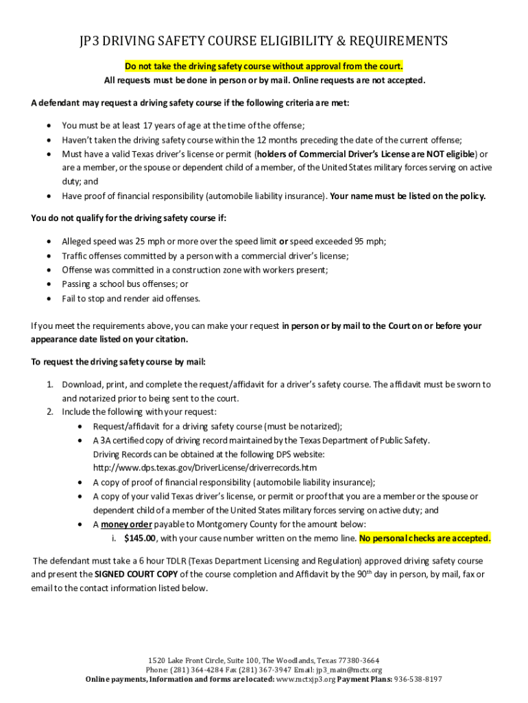 JP3 DRIVING SAFETY COURSE ELIGIBILITY & REQUIREMENTS Do not take the driving safety course without approval from the court. All requests must be done in person or by mail. Online requests are not