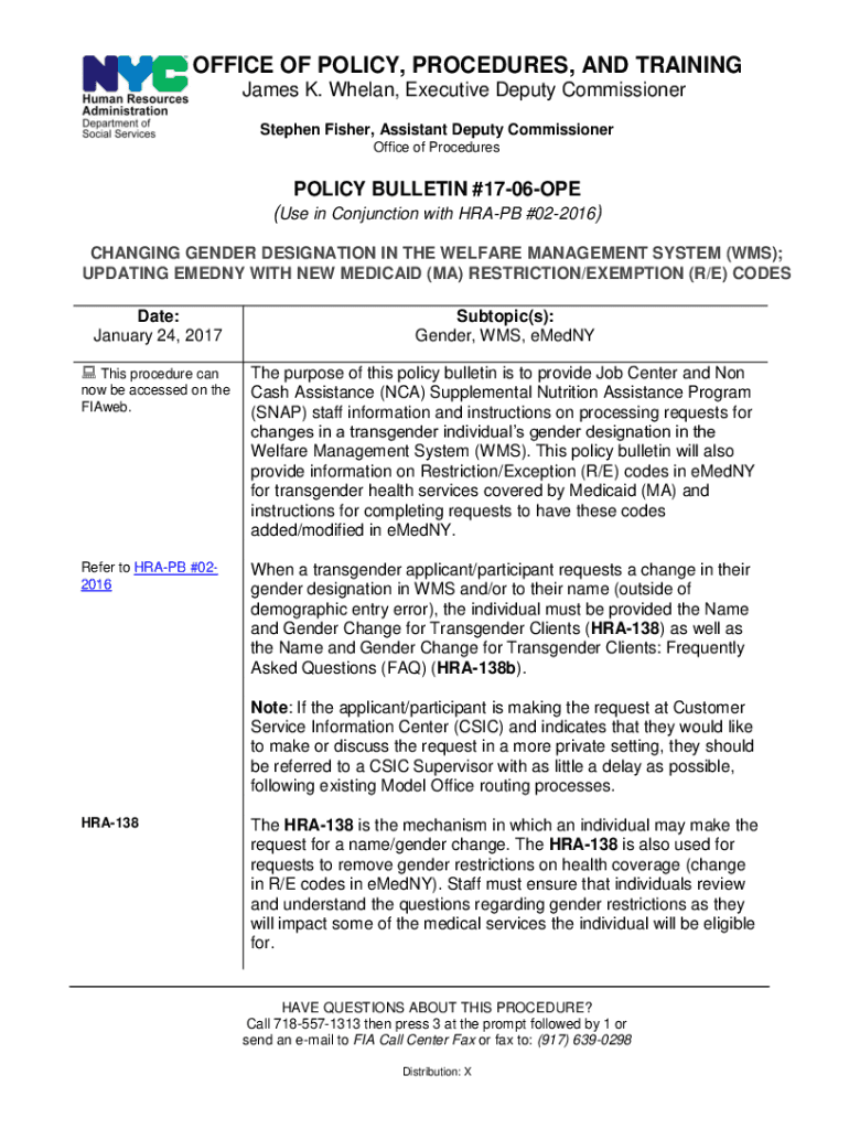 OFFICE OF POLICY, PROCEDURES, AND TRAINING James K. Wherein, Executive Deputy Commissioner Stephen Fisher, Assistant Deputy Commissioner Office of ProceduresPOLICY BULLETIN #1706OPE (Use in Conjunction